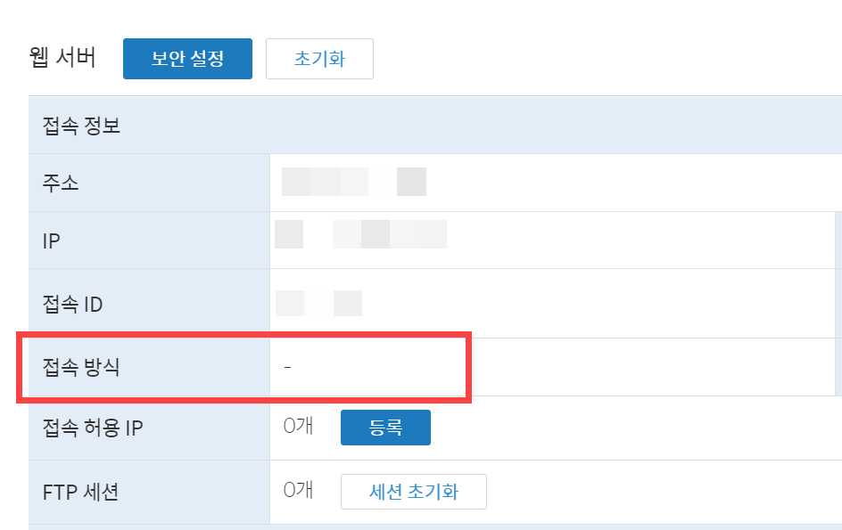 웹 서버 섹션에서 접속 방식이 FTP 등으로 표시되지 않고 하이픈('-')이 표시되어 있다면 FTP 접속 기간이 만료된 것입니다.