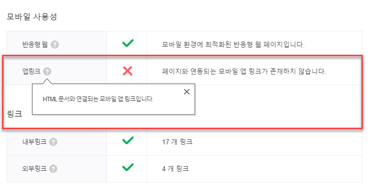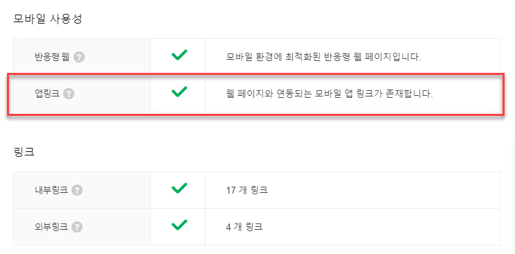 저장한 후에 다시 웹 페이지 최적화 검증을 실시해보면 X 표시가 없어지고 "웹 페이지와 연동되는 모바일 앱 링크가 존재합니다."로 바뀌어 있을 것입니다.