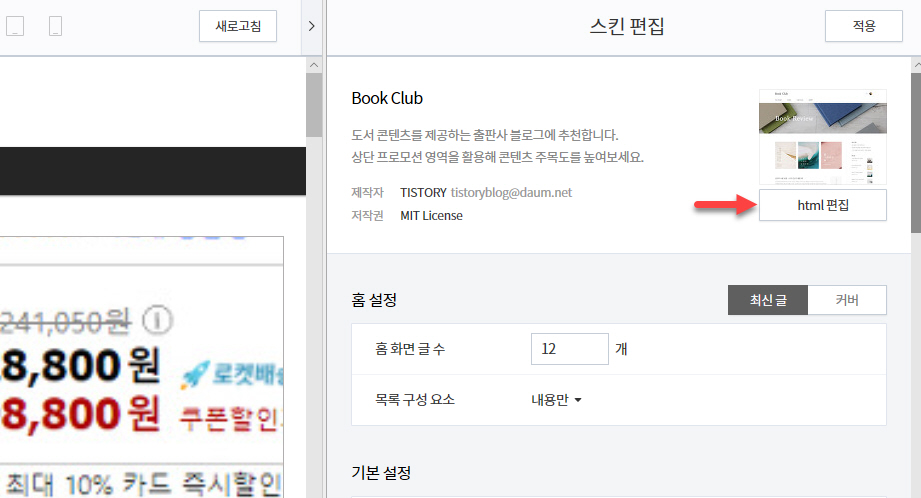 스킨 편집 화면이 표시되면 "html 편집"을 클릭합니다.