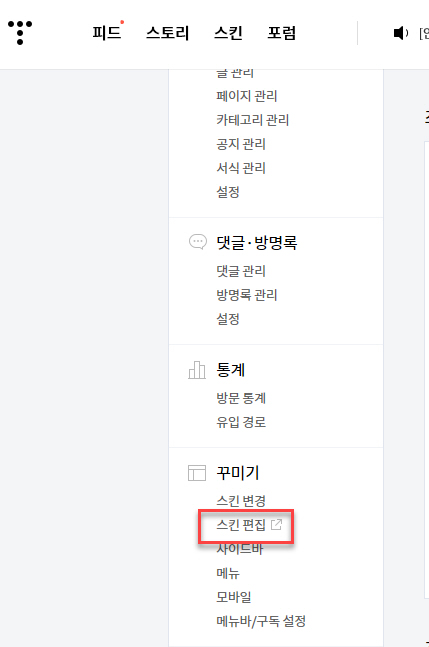 티스토리의 경우 꾸미기 > 스킨 편집을 클릭합니다.