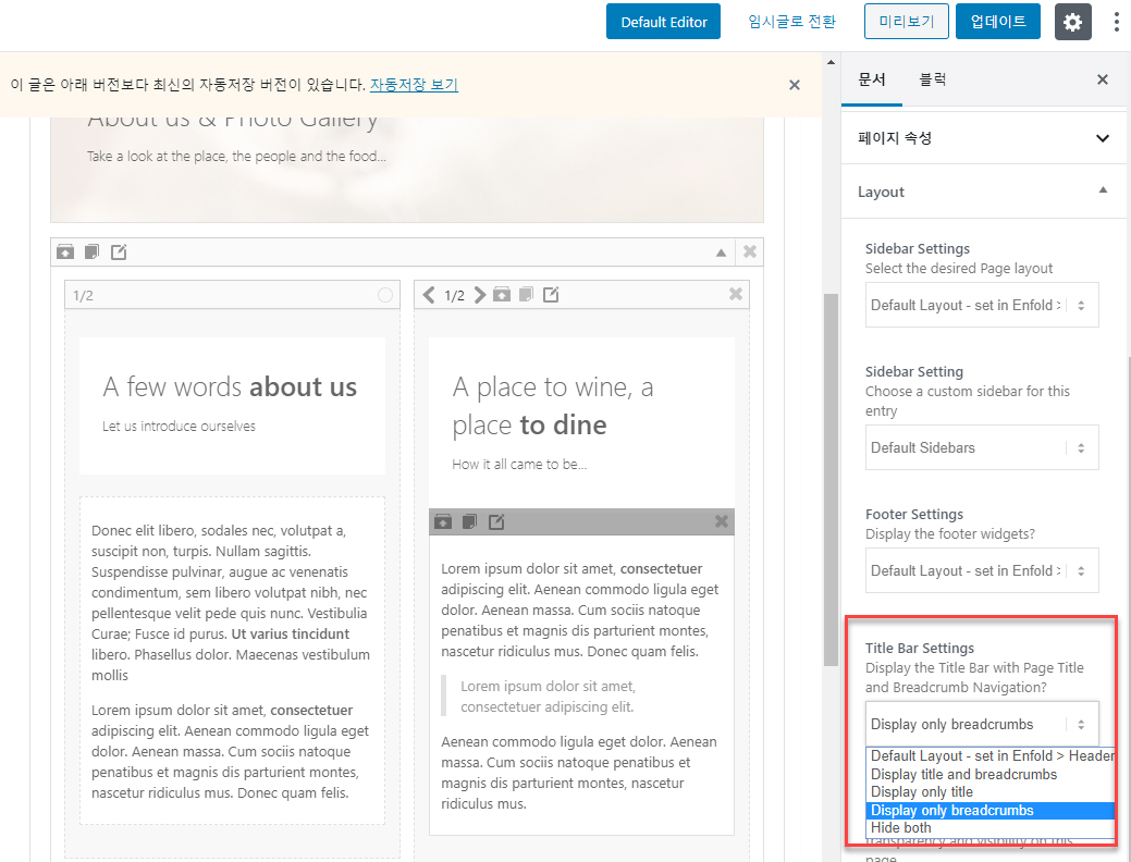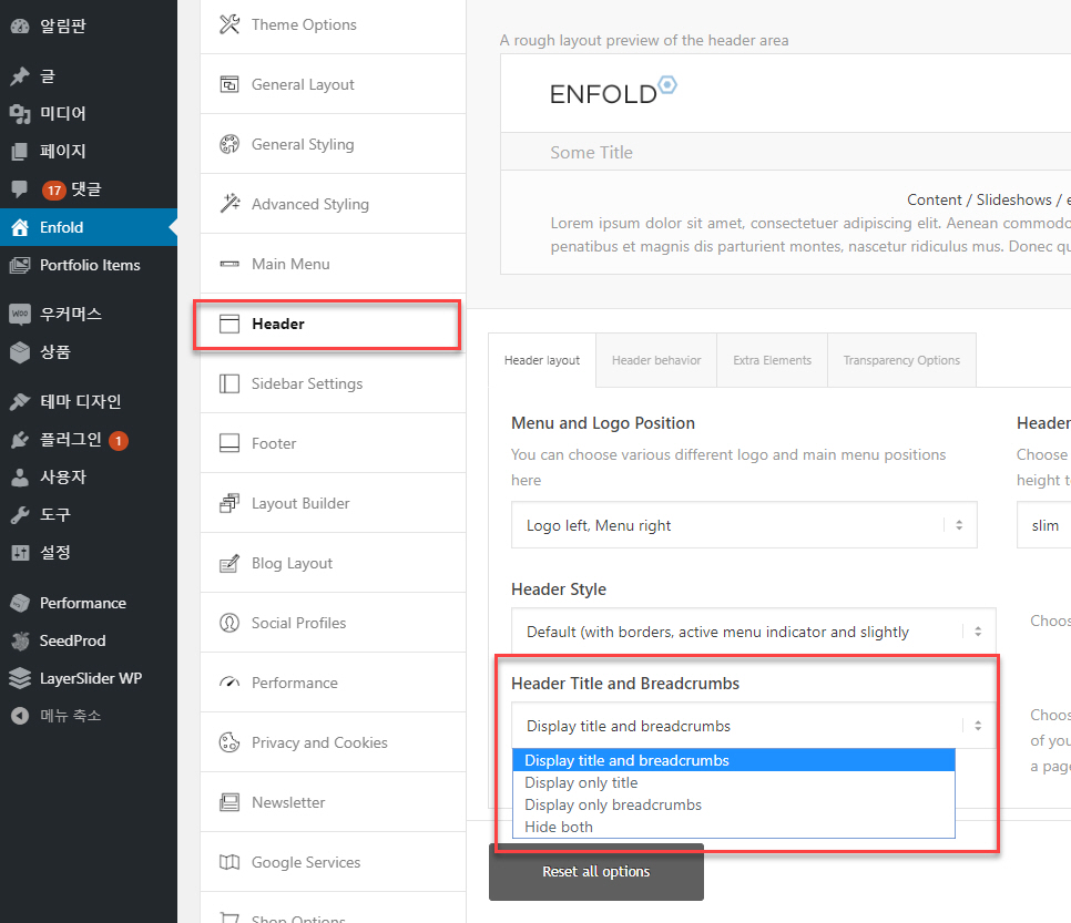 테마 옵션에서는 Enfold > Header로 이동하여 Header Title and Breadcrumbs에서 설정이 가능합니다.