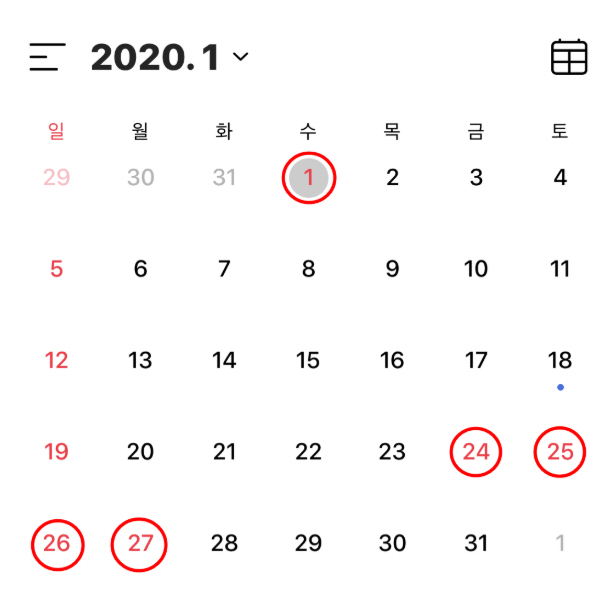2020년 달력을 보니 공휴일이 다른 해보다 적은 것 같습니다. 1월 25일 토요일이 설날이고 24일 금요일부터 27일 월요일까지 설 연휴네요.