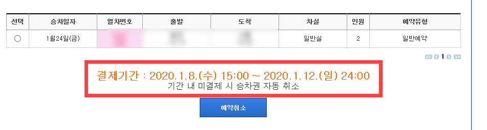 예약한 승차권은 1월 8일 수요일 오후 3시부터 1월 12일 일요일 자정까지 결제하지 않으면 자동 취소됩니다.
