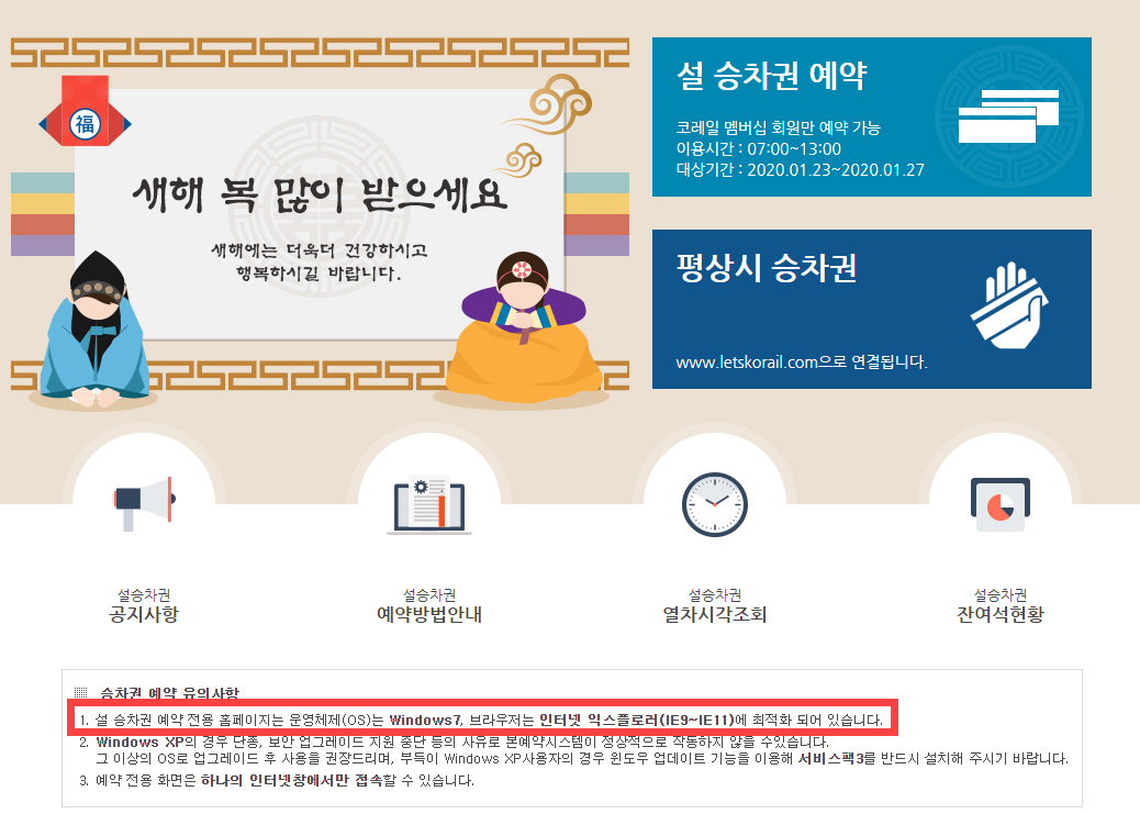 설 승차권 예약 전용 홈페이지는 윈도우 7 운영 체제와 인터넷 익스플로러 (IE 9 ~ IE11)에 취적화되어 있습니다. (일주일 후(1월 14일)에 윈도우 7에 대한 지원 중단이 예정되어 있습니다.) 하지만 윈도우 10, 엣지 브라우저에서도 문제없이 작동하네요.