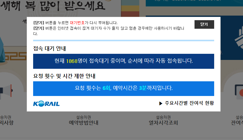 2020년 설 연휴 열차 승차권 예매가 오늘(1월 7일)과 내일(1월 8일) 진행됩니다. 인터넷을 통한 예매는 경부선의 경우 오늘 오전 7시에 시작되었습니다.