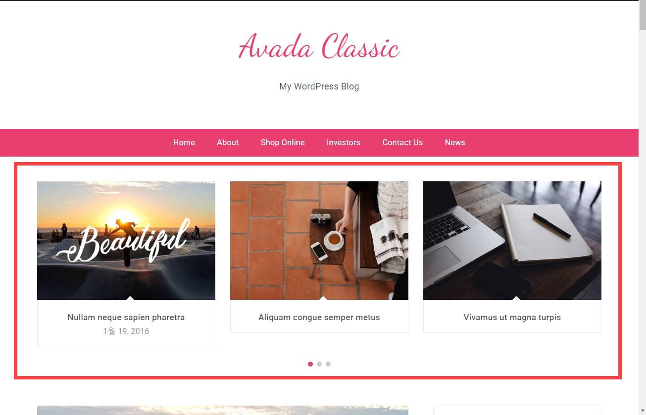 변경 사항을 저장한 후에 사이트를 리로드하면 그림과 같이 메뉴 아래에 슬라이더가 표시됩니다.