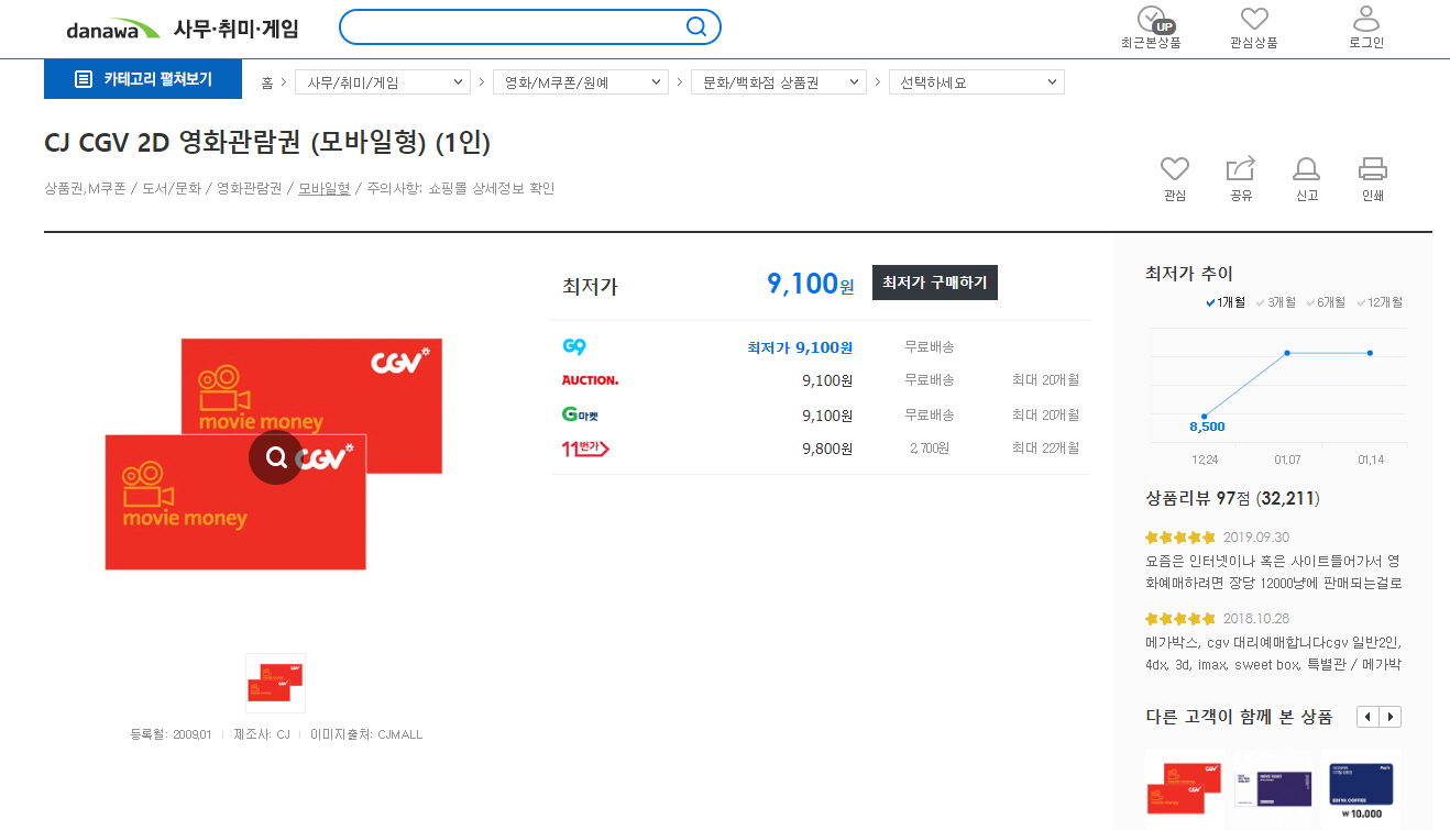 저는 다나와에서 CJ CGV 2D 영화관람권 (모바일형)을 검색하여 영화관람권을 구입했습니다.