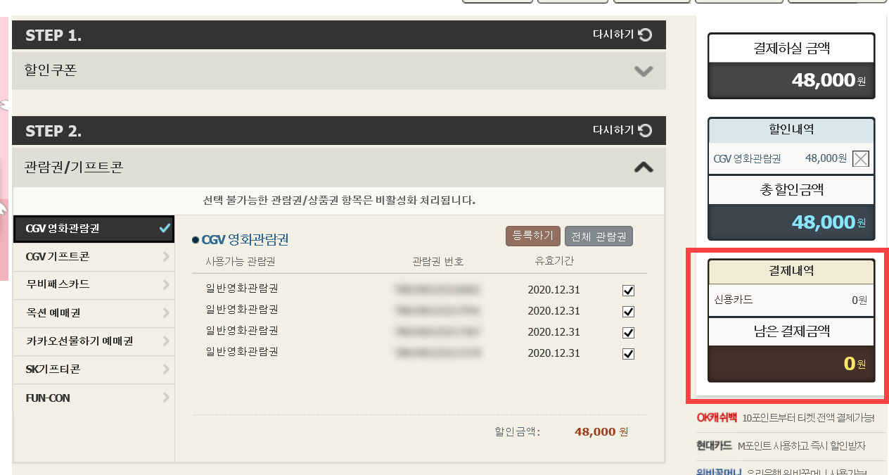 결제 시에 관람권을 선택하면 한 장단 12000원씩 차감됩니다.