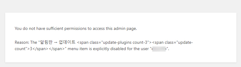 Reason: The "알림판 -> 업데이트" menu item is explicitly disabled for the user "..."