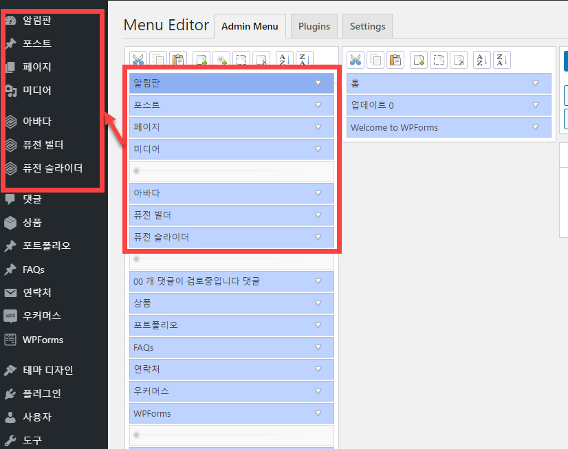 이 플러그인을 사용하면 위의 그림처럼 메뉴 위치를 자유롭게 조정할 수 있고 영어로 된 메뉴 이름도 쉽게 한글로 바꿀 수 있습니다(예: Avada -> 아바다). 메뉴 이름도 원하는 대로 수정이 가능합니다(예: 글 -> 포스트).