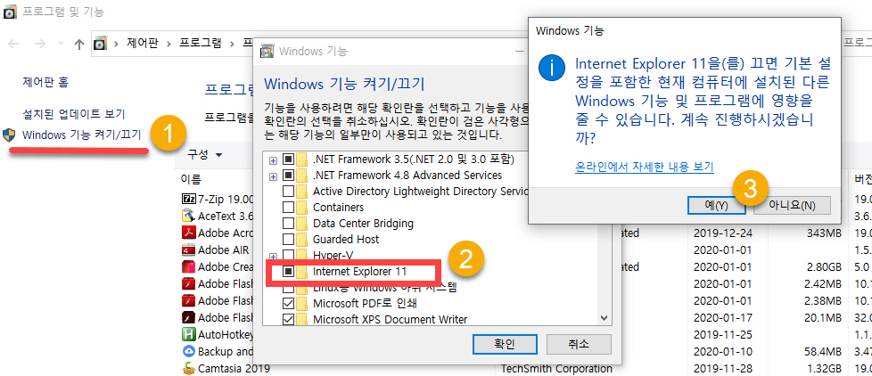 Internet Explorer 11 체크박스의 선택을 해제(②)합니다. 그러면 "Internet Explorer 11을(를) 끄면 기본 설정을 포함한 현재 컴퓨터에 설치된 다른 Windows 기능 및 프로그램에 영향을 줄 수 있습니다. 계속하시겠습니까?" 경고 창이 표시됩니다. "예"(③)를 클릭하면 IE11이 제거됩니다. 제거가 완료되면 시스템 "다시 시작"을 선택하여 시스템을 다시 시작하도록 합니다.