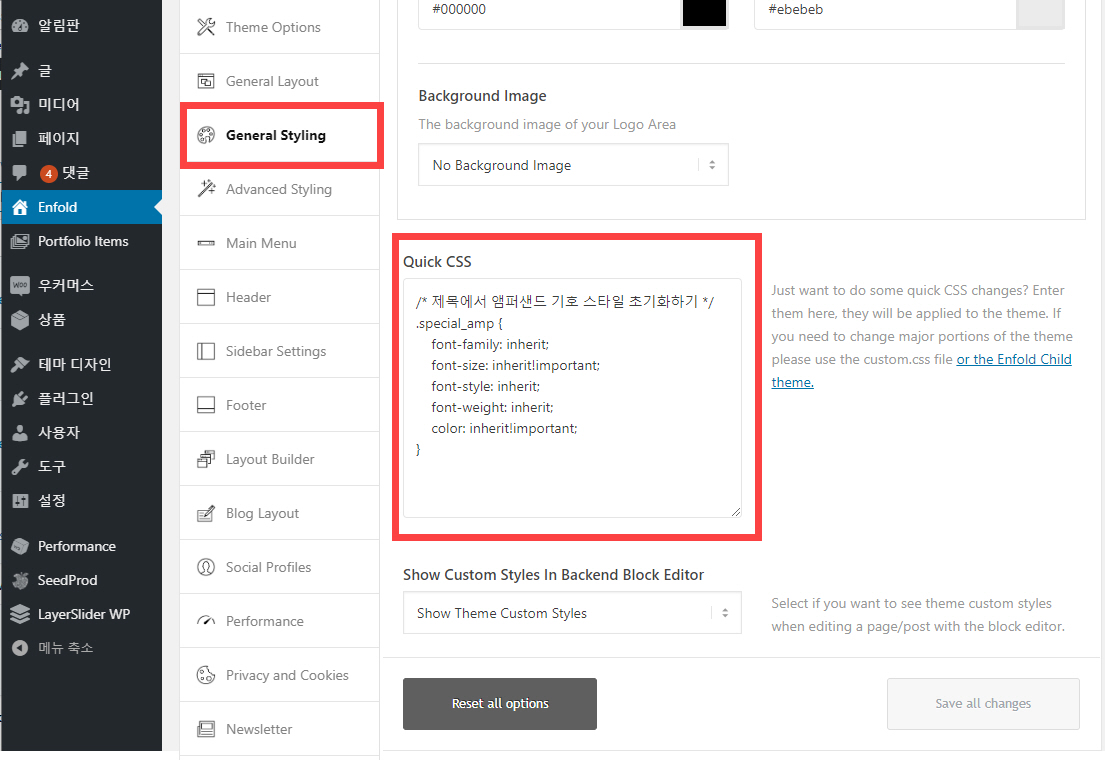 엔폴드 테마에서는 워드프레스 알림판 > Enfold > General Styling으로 이동한 후에 Quick CSS 박스에 위의 코드를 넣으면 됩니다.