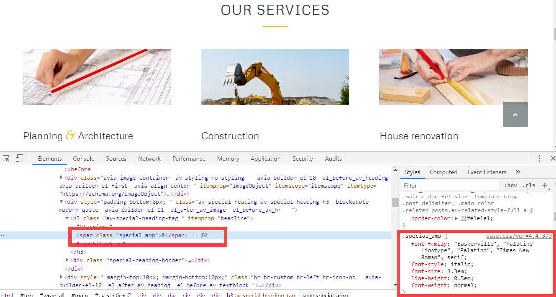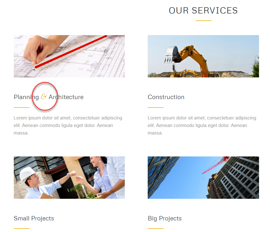 Enfold 테마의 일부 데모에서는 앰퍼샌드 (&) 기호에 특수한 스타일이 적용될 수 있습니다. 예를 들어, Construction Demo를 설치하면 제목 부분의 앰퍼샌드 기호가 다음 그림과 같은 스타일로 표시됩니다.