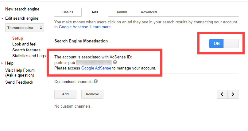 저는 Search Engine Monetisation(검색엔진 수익화) 기능을 비활성화(OFF)한 상태입니다. 만약 ON으로 설정하면 구글 AdSense ID가 연결되어 수익을 얻을 수 있습니다. (제 노트북의 크롬 브라우저에서 구글 계정에 로그인하면 크롬 브라우저 언어는 한국어인데 구글 CSE 페이지의 인터페이스가 왜 영어로 표시되는지 모르겠습니다.)