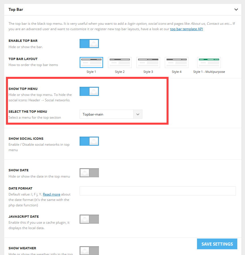- Show Top Menu - 상단 메뉴 표시 여부 지정. 이 옵션을 활성화하면 탑바 영역에 탑 메뉴(상단 메뉴)가 표시됩니다.