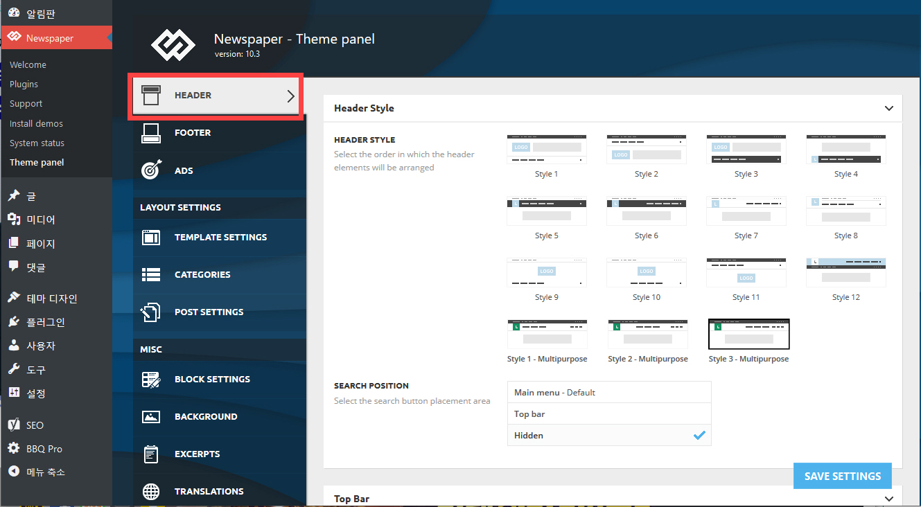 워드프레스 관리자 페이지에서 Newspaper > Header 페이지에서 헤더 관련 옵션을 지정할 수 있습니다.