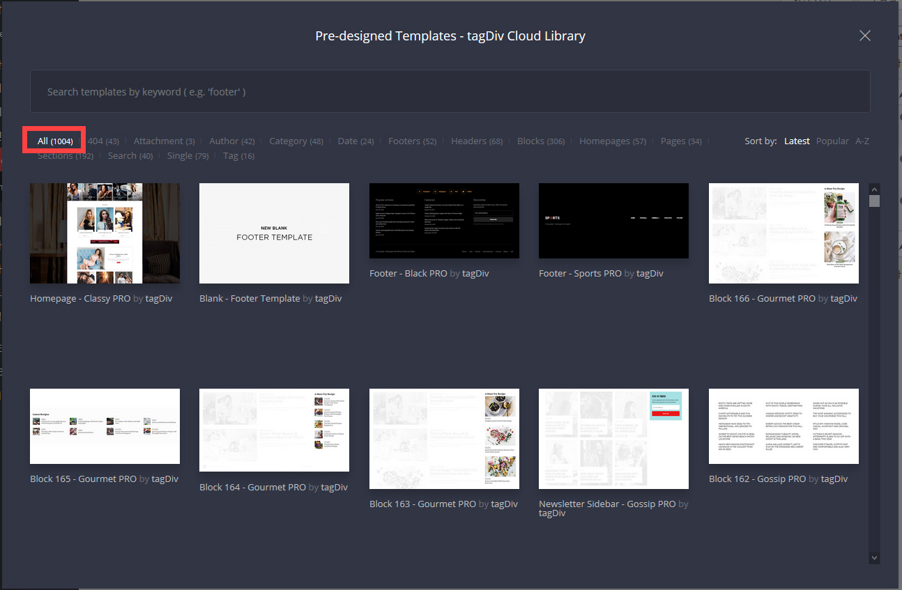 2020년 2월 16일 현재 1004개의 사전 디자인된 tagDiv 클라우드 라이브러리를 이용할 수 있습니다.