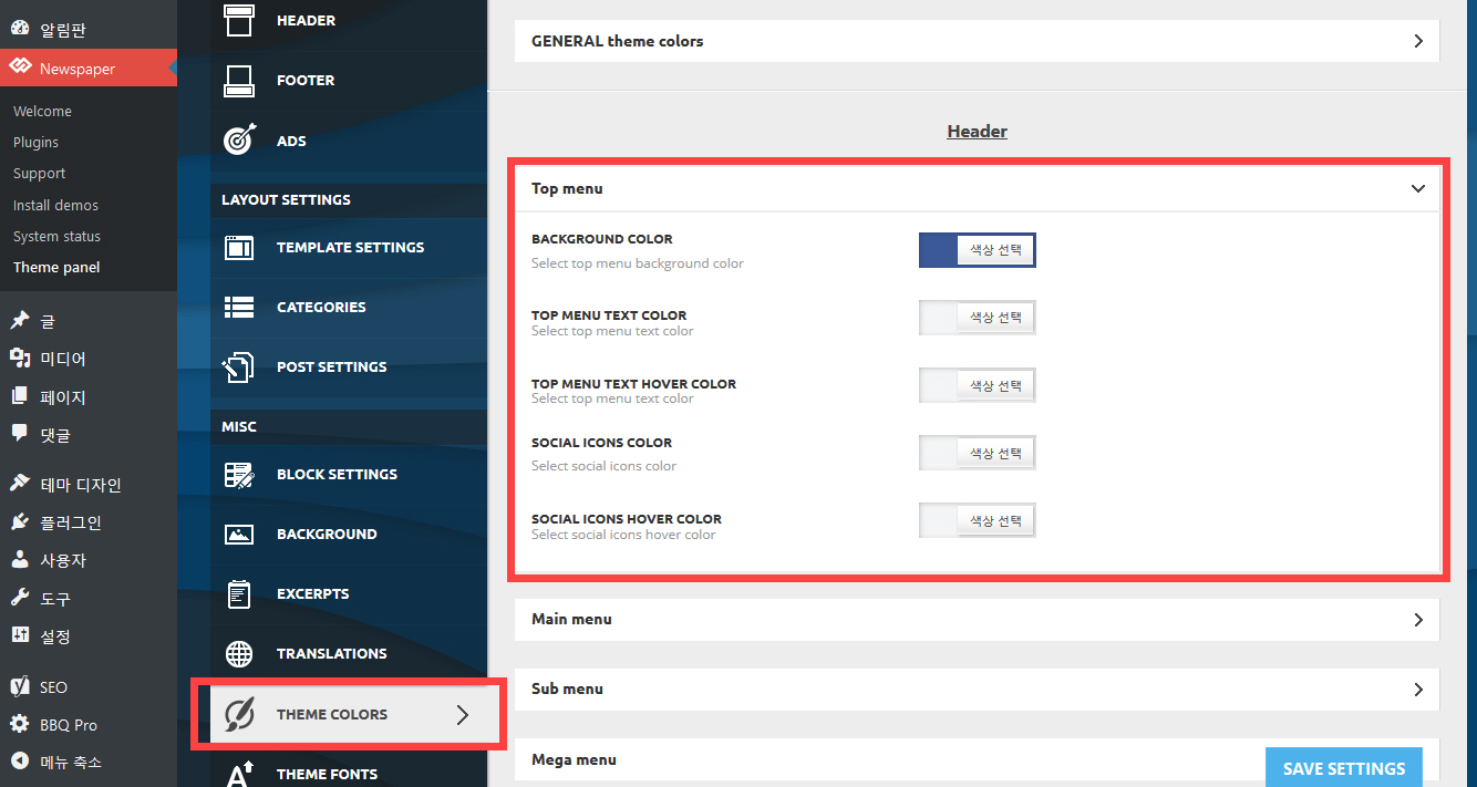 상단 메뉴의 색상은 Newspaper > Theme Colors > Header > Top menu에서 지정할 수 있습니다.