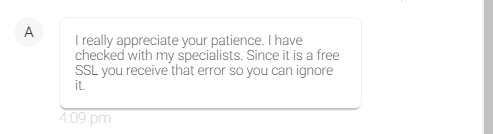 이런 경고 팝업이 표시되어도 무시하고 FTP에 접속하면 정상적으로 사용할 수 있습니다. 이 문제에 대해 블루호스트 담당자에게 문의해보니 specialist (전문가 - 블루호스트에서 고급 개발자를 부르는 호칭 같습니다)에게 물어보니 무료 SSL이기 때문에 이 오류가 발생하며 무시할 수 있다고 합니다.