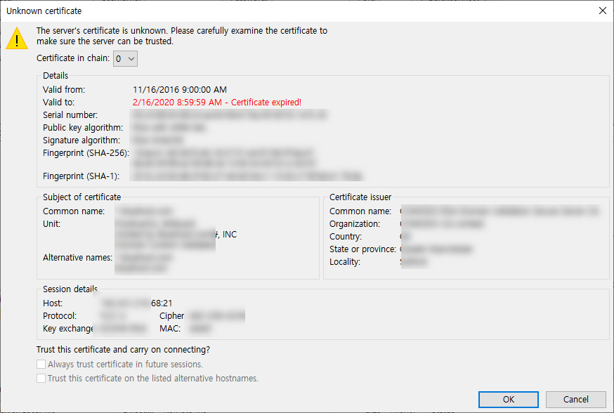 '알 수 없는 서버 인증서입니다. 신뢰할 수 있는 서버인지 인증서를 잘 확인하십시오. (The server's certificate is unknown. Please carefully examine the certifciate to make sure the server can be trusted.)' 메시지가 함께 표시되고 인증서가 만료되었고 알려줍니다.