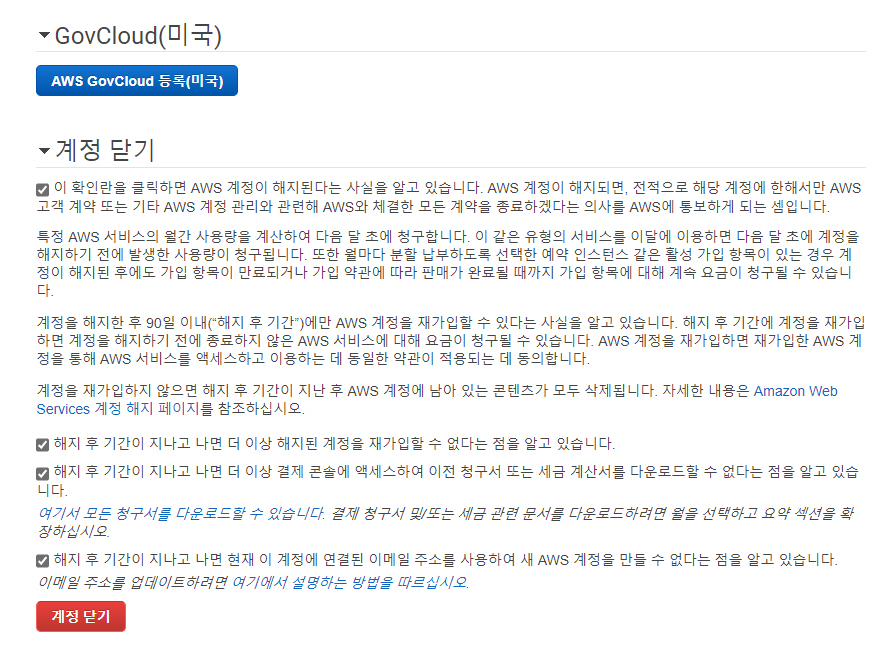 계정을 해지한 후 90일 이내("해지 후 기간")에만 AWS 계정에 재가입할 수 있고, 해지 후 기간이 지나면 더 이상 해지된 계정에 재가입할 수 없게 됩니다.
