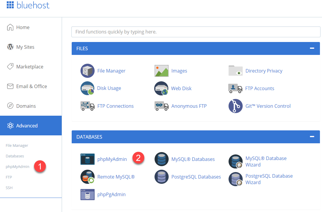 블루호스트에서 phpMyAdmin에 접속하는 방법