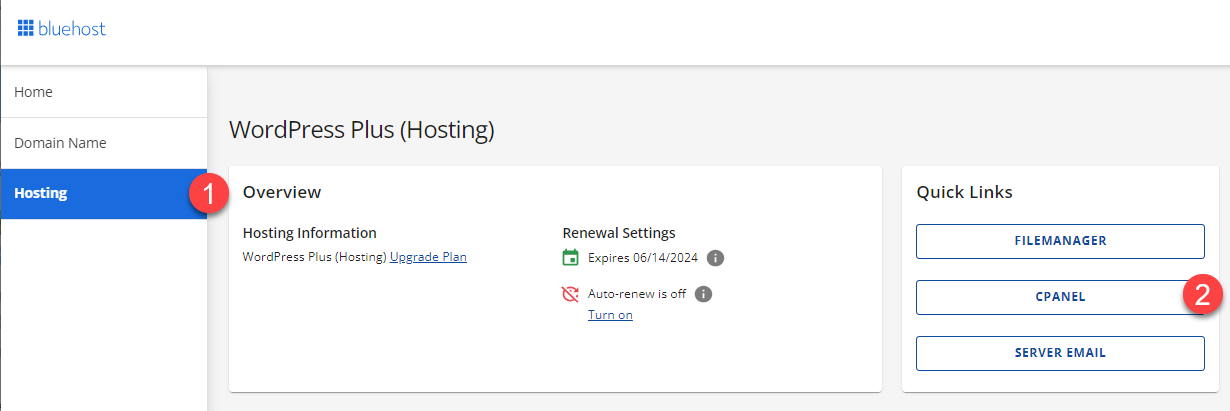 왼쪽의 Hosting 탭을 클릭하고 Quick Links의 cPanel 버튼을 클릭합니다.