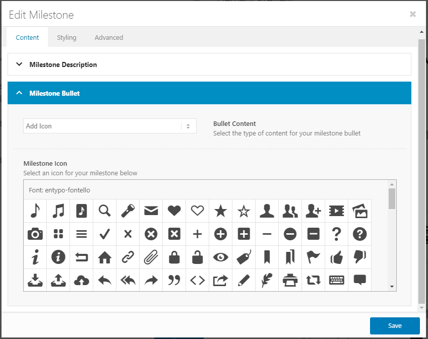 계속하여 아래의 Milestone Bullet에서 아이콘을 선택할 수 있습니다.