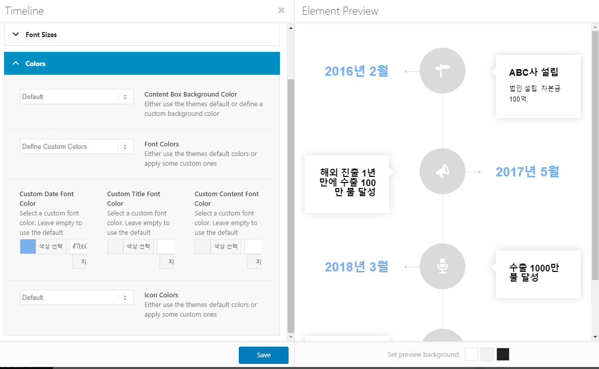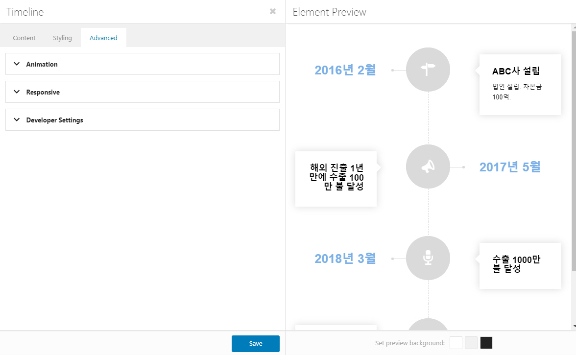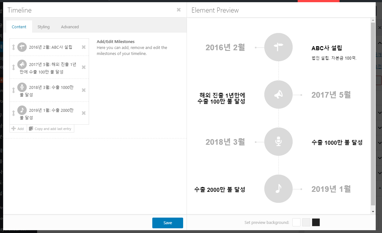 마일스톤 항목을 모두 입력하면 오른쪽에 타임라인이 실제 어떻게 표시되는지 미리보기를 통해 확인할 수 있습니다.