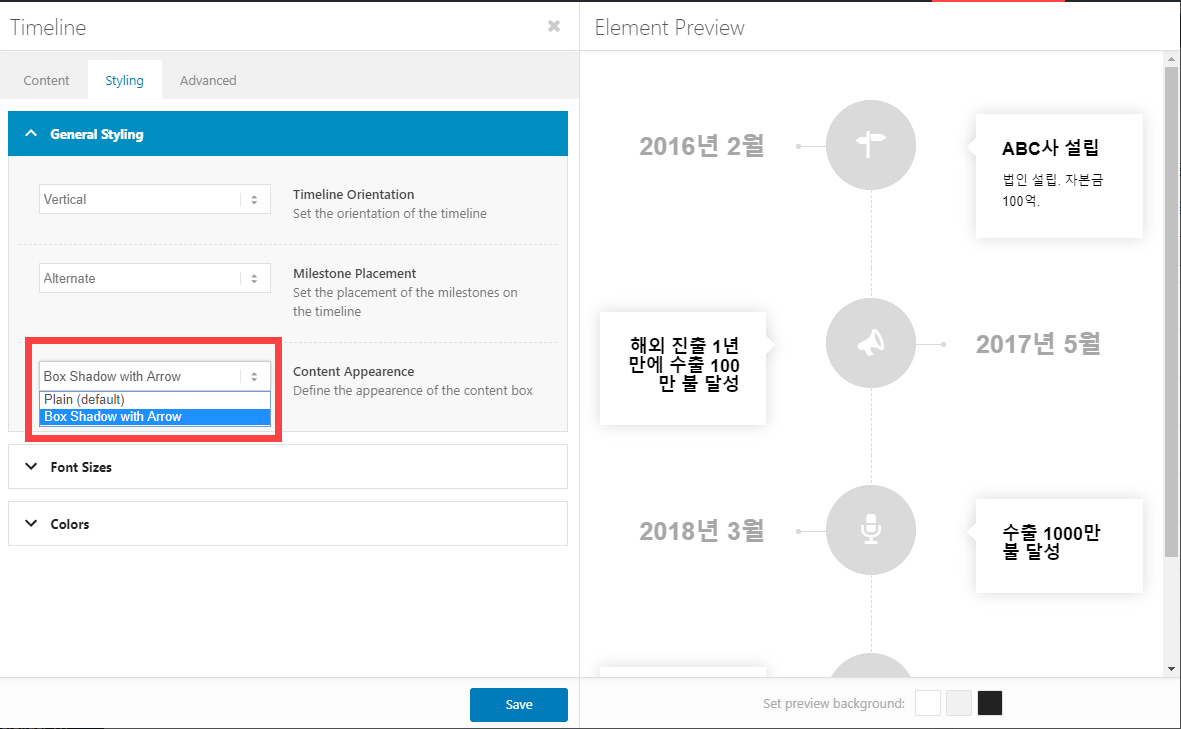 Content Appearance에서 콘텐츠를 박스로 표시할지 여부를 선택할 수 있습니다. Box Shadow with Arrow(화살표와 함께 음영 효과가 적용된 박스)를 선택하면 아래 그림과 같이 타임라인이 표시됩니다. 기본은 Plain(일반)입니다.