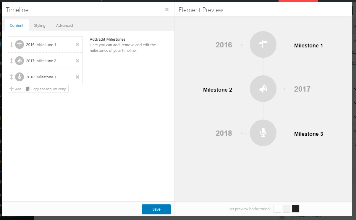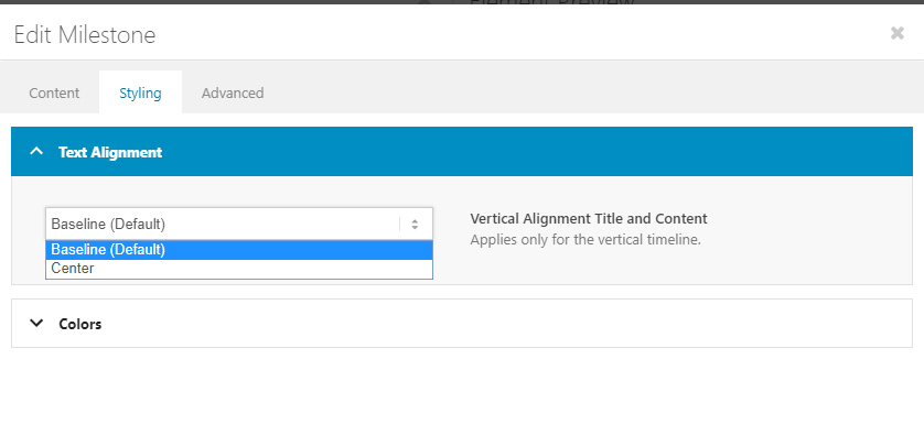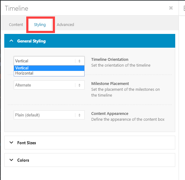 기본적으로 날짜와 제목이 교대로 표시됩니다. 타임라인 스타일을 변경하려면 Styling 탭을 클릭합니다.