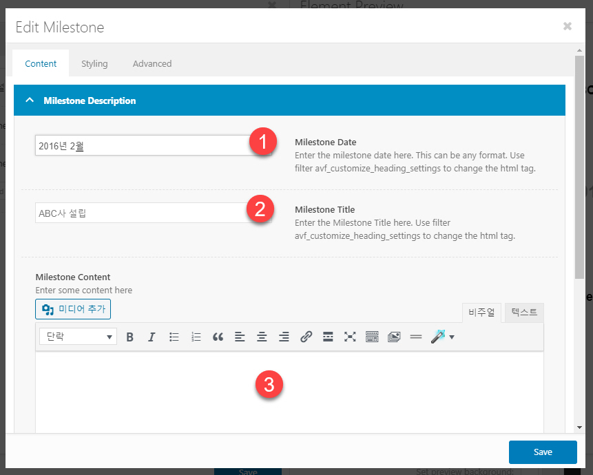Edit Milestone 창이 표시되면 Content 탭의 Milestone Description 섹션에서 타임라인 항목으로 표시되는 마일스톤의 날짜, 제목, 그리고 콘텐츠를 추가할 수 있습니다. Milestone Date에 날짜(예: 2020.3.13)를 입력하고, Milestone Title에 제목을 입력합니다. Milestone Content에 내용을 입력할 수 있습니다. 이 항목을 입력하면 Milestone Title 아래에 표시됩니다.