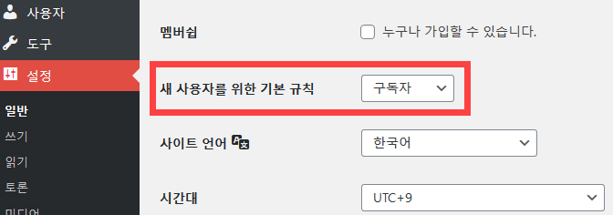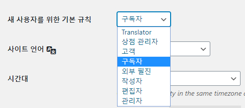 워드프레스 회원가입 시 새 사용자의 기본 사용자 역할 설정