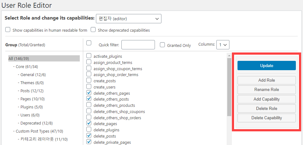 이 플러그인을 설치하고 활성화한 후에 알림판 > 사용자 > User Role Editor 페이지에서 각 역할의 권한(Capability)을 수정하거나 새로운 역할을 추가, 역할 이름 변경, 역할 삭제 등의 작업을 할 수 있습니다.