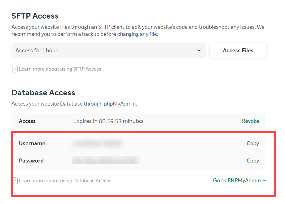 Database Access 아래의 Access Database를 클릭하면 데이터베이스에 접속할 수 있는 정보가 표시됩니다.