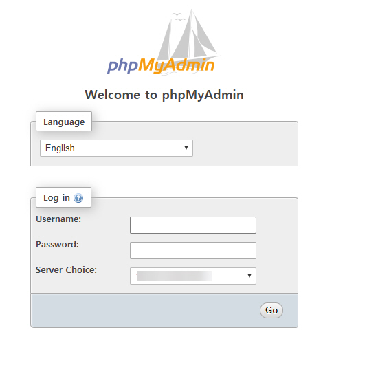 Username(사용자명)과 Password(패스워드)를 입력하고 Go를 클릭하면 phpMyAdmin에 접속할 수 있습니다.