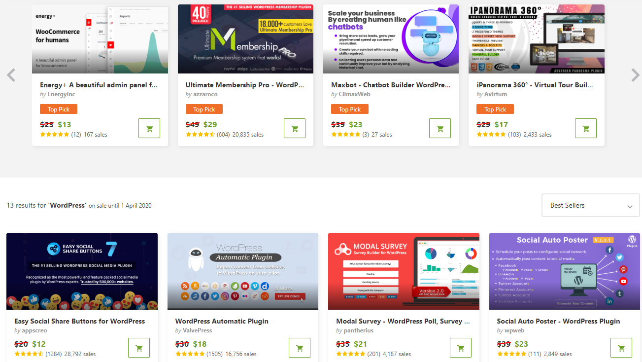 워드프레스 프러그인의 경우에는 Ultimate Membership Pro, Modal Survey, Easy Social Share Buttons for WordPress 등이 할인 대상 품목으로 선정되었습니다.