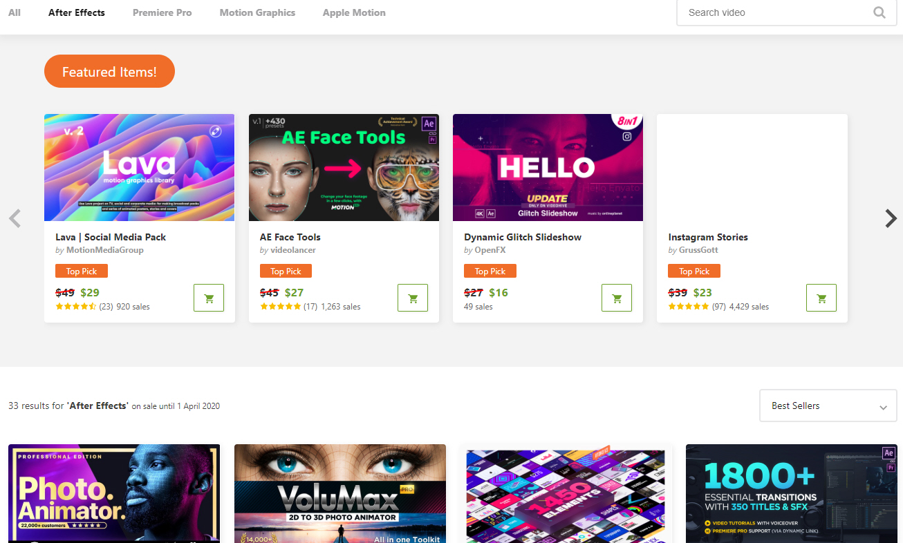 After Effects, Premier Pro, Motion Graphics, Apple Motion 등에 사용할 수 있는 동영상 템플릿도 일부 품목을 40% 할인된 가격에 구입할 수 있습니다.