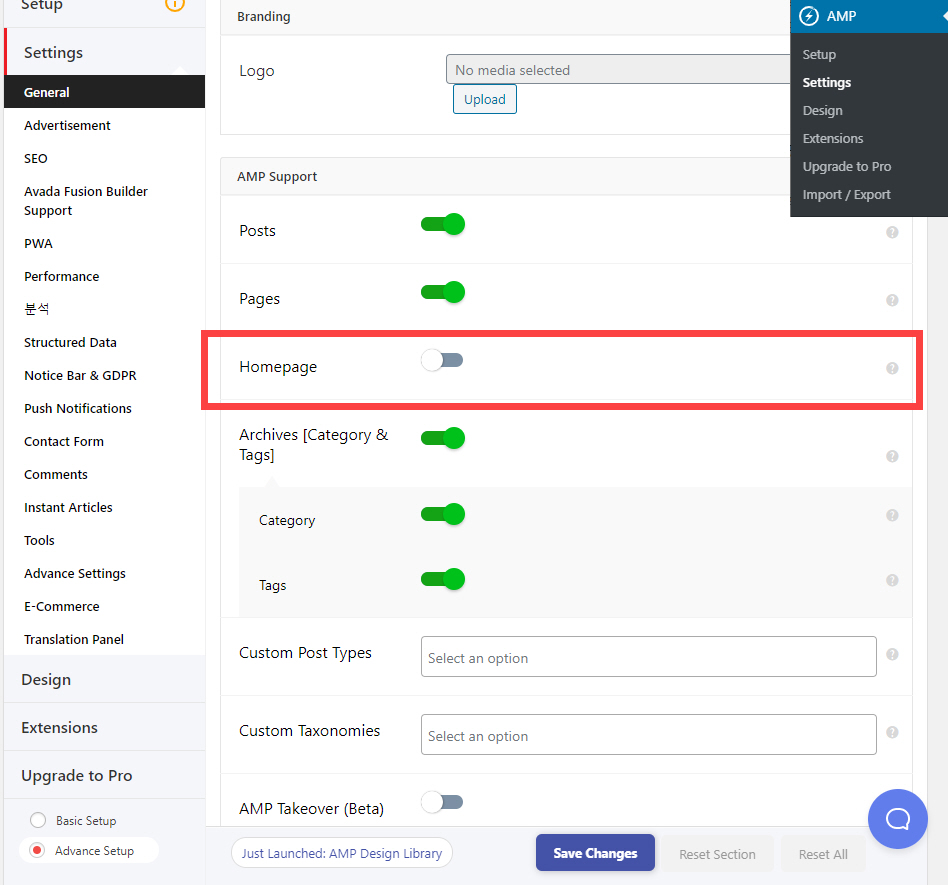 General 탭에서 AMP Support > Homepage 옵션을 비활성화(OFF)하는 경우 www.example.com/amp 페이지를 방문하면 비 AMP 페이지(즉, www.example.com)로 리디렉션됩니다.