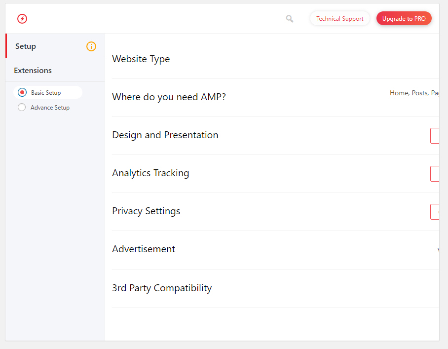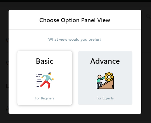 AMP for WP를 설치하고 활성화하면 Basic Setup과 Advanced Setup 중에서 패널 보기를 선택하도록 안내하는 팝업을 표시합니다.