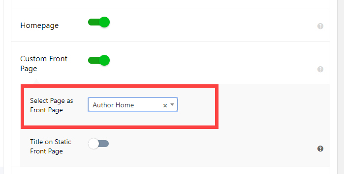 전면 페이지를 지정하려는 경우 Custom Front Page (사용자 정의 전면 페이지)를 활성화(ON)하도록 합니다. 그러면 전면 페이지를 직접 지정할 수 있는 옵션이 표시됩니다.