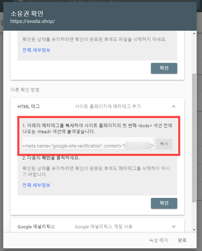 메타태그를 복사하도록 합니다. 이 메타태그에서 content 부분의 코드를 가입형 워드프레스의 도구에 입력하고 "확인"을 클릭하면 소유권 확인이 됩니다.