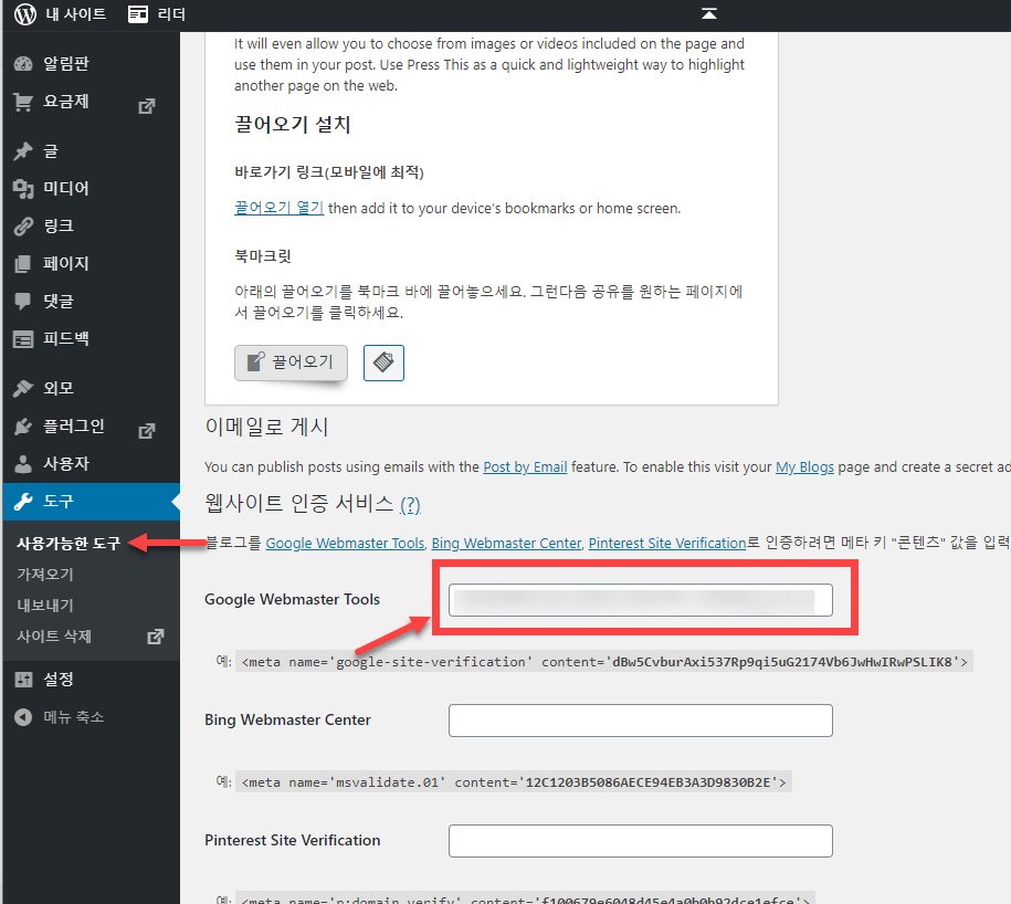 웹사이트 인증 서비스 섹션에서 Google Webmaster Tools 옆의 빈 칸에 위에서 복사했던 코드를 입력합니다.