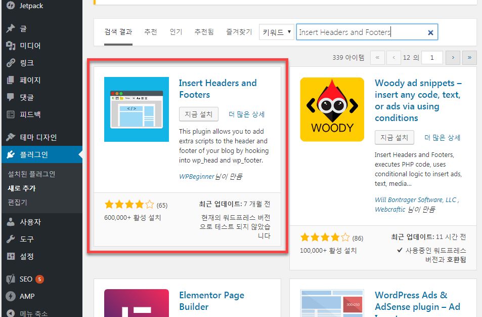 비즈니스 요금제를 이용하는 경우 워드프레스 관리자 페이지에서 플러그인 > 새로 추가를 클릭하고 “Insert Headers and Footers”를 검색하여 플러그인을 설치하도록 합니다.