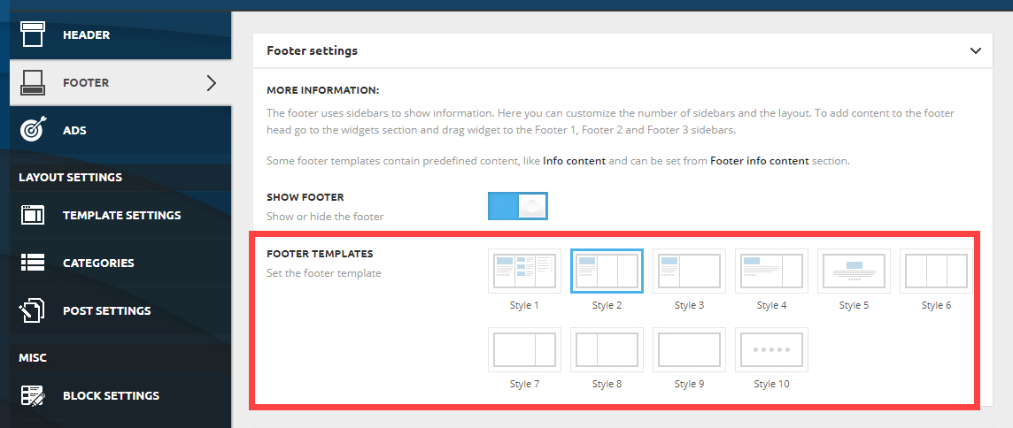 Footer Templates에서 10개 스타일 중에서 선택할 수 있습니다.