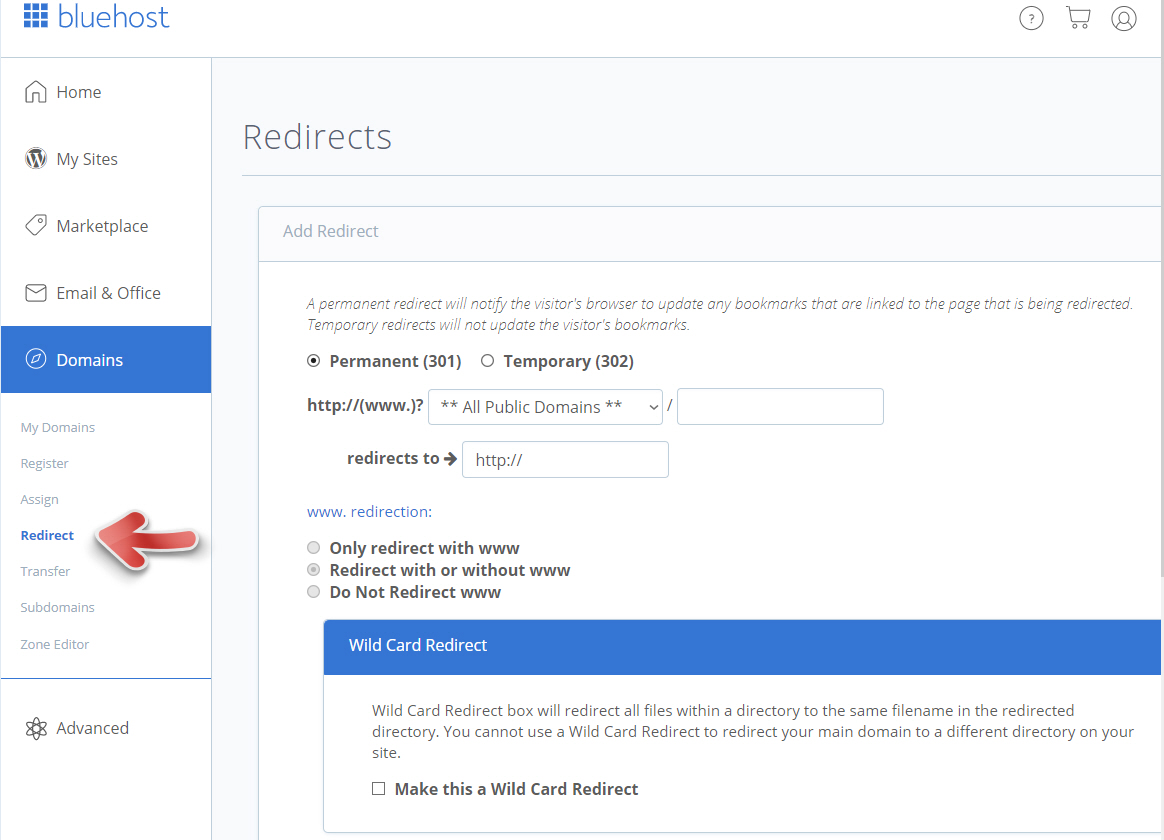 블루호스트 등과 같이 cPanel이 제공되는 웹호스팅을 이용하는 경우에는 cPanel에서 제공되는 Redirects 툴을 사용하여 리디렉션을 설정하는 것도 가능합니다. 예를 들어, 블루호스트 (Bluehost)의 경우 블루호스트 홈페이지에 로그인한 후에 Domains > Redirects에서 301 리다이렉트를 추가할 수 있습니다.