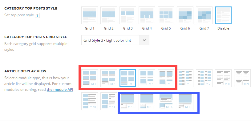 예를 들어, Newsmag 테마의 테마 패널에서 카테고리 템플릿의 스타일을 지정할 수 있습니다. 아래 그림에서 2열로 표시되는 M3을 지정하면 썸네일 이미지의 너비가 300px가 됩니다.