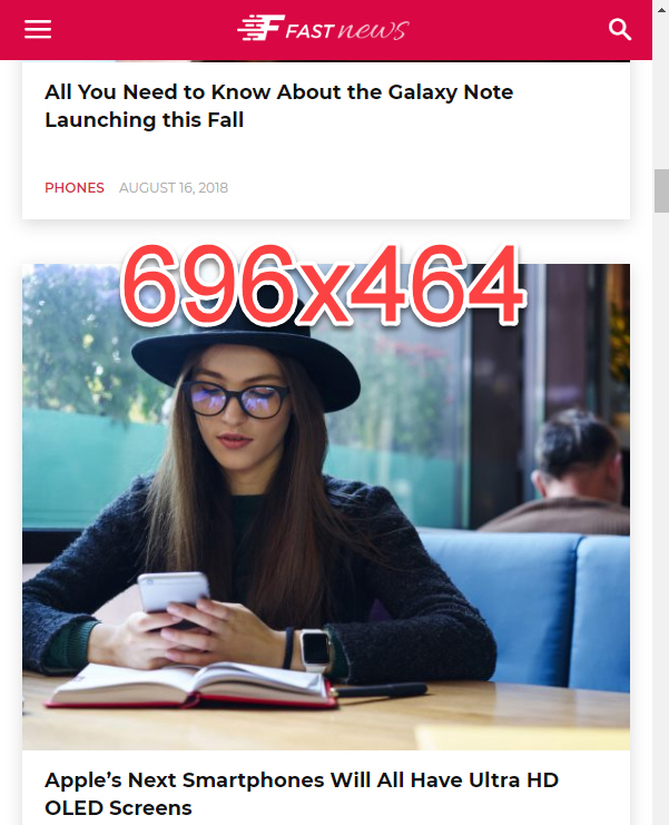 위의 그림은 뉴스페이퍼 데모에서 캡처한 것인데요. 스마트폰 화면에서도 이미지가 위의 Newsmag보다는 확실히 선명해보일 것입니다. 그 이유는 이 화면의 썸네일 이미지 크기가 696x464px이기 때문입니다. 이미지 자체가 크기 때문에 PC와 모바일 모두에서 선명하게 보입니다.