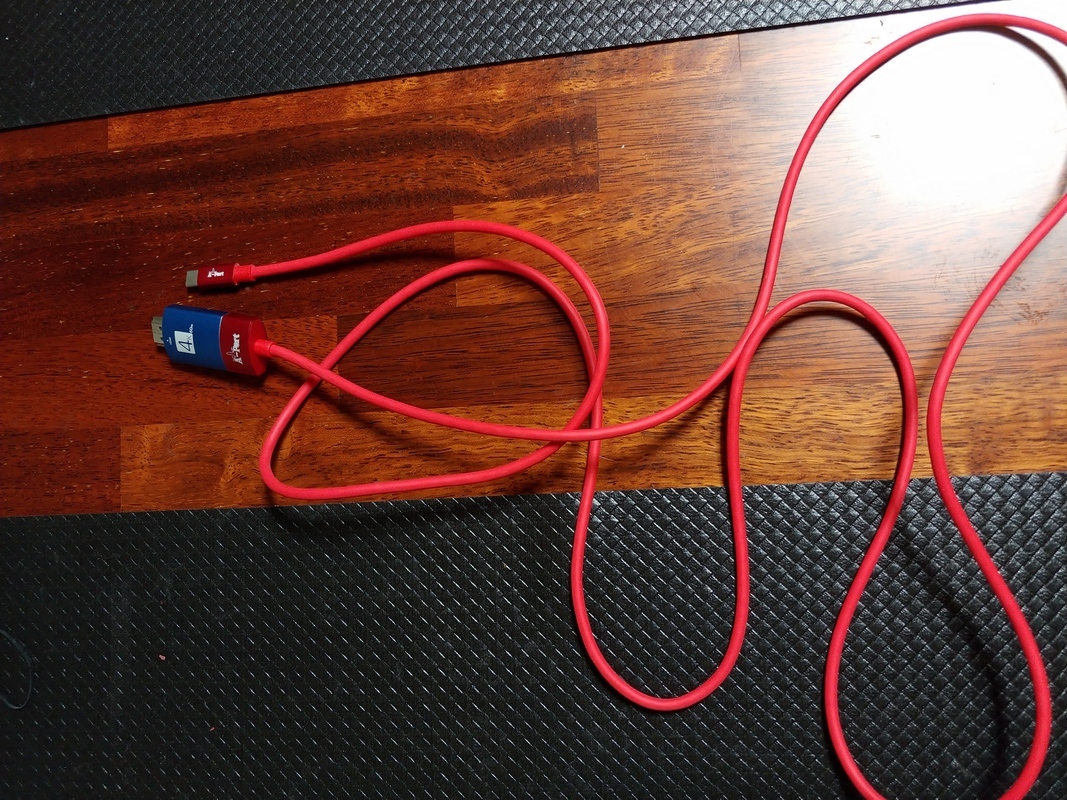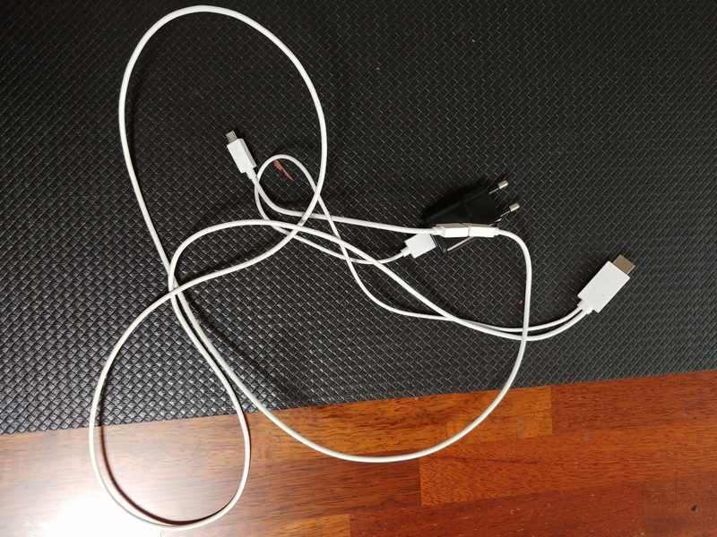 몇 전 전에 구입했던 구형 스마트폰용 MHL 미러링 케이블. 충전기를 함께 사용해야 하고 케이블이 복잡하다.