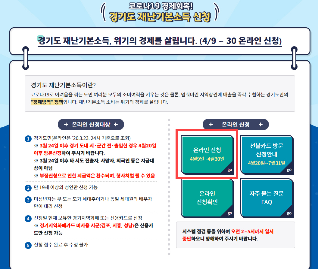 경기도 재난기본소득을 신청하려면 경기도 재난기본소득 홈페이지에 접속하여 "온라인 신청" 아이콘을 클릭하여 순서대로 진행하면 됩니다.